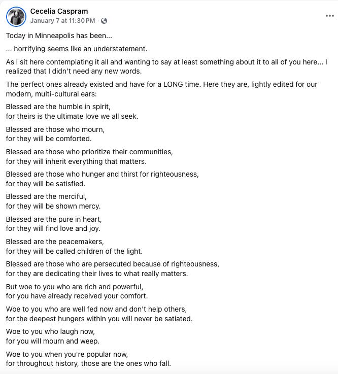 On the day Renee Good was murdered, and the trauma of it all washed over every one of us here in Minneapolis, I felt like I wanted to reach out to my community on Facebook (you can follow me there for the most of-the-moment reflections and news from me), to say at least something.